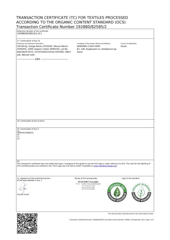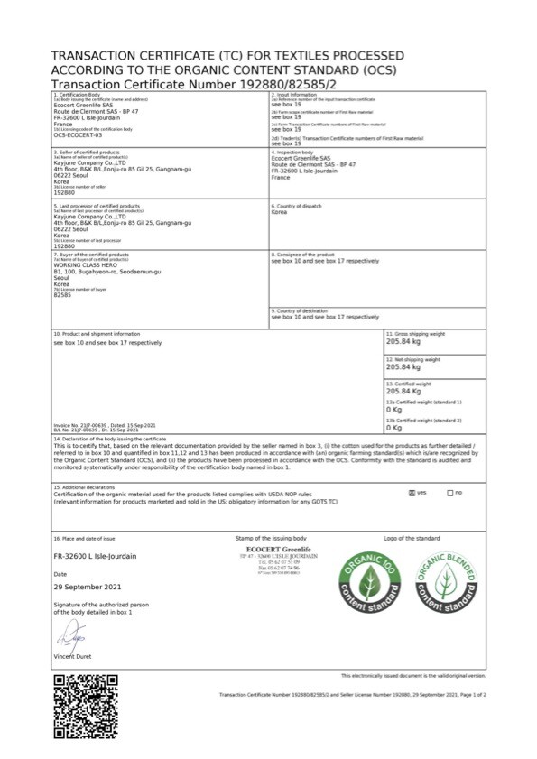 · 국제 오가닉코튼 인증인 OCS(Organic Content Standard)인증을 받은 원단입니다.